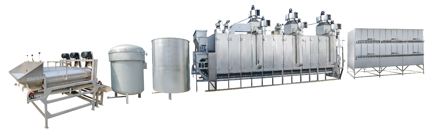 該生產(chǎn)線主要用于加工蒜香、五香、奶香等口味的花生果。是集花生果清洗、蒸煮、入味、烘烤脫水、烘烤干燥及揀選包裝為一體的自動(dòng)化生產(chǎn)線。